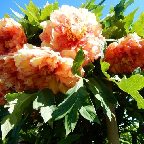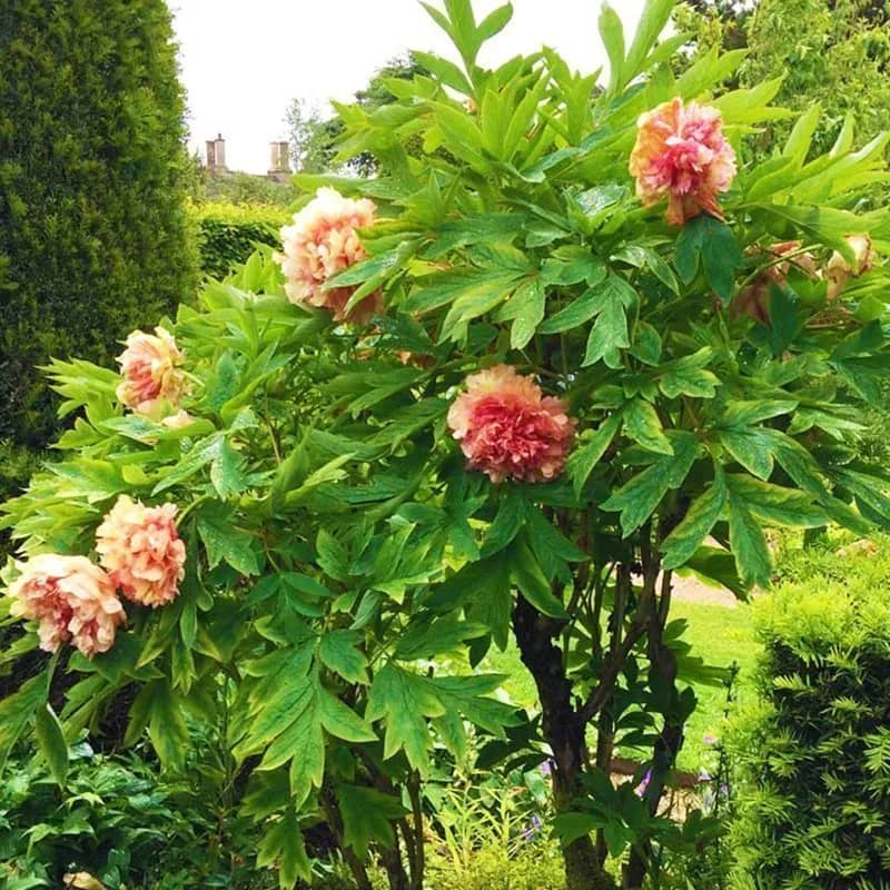Цветки размещаются на конечностях стеблей, их диаметр составляет 12-20 см и больше. Такие цветы бывают махровые, полумахровые и обычные, но не менее красивые. Они могут быть белые, фиолетовые, желтые, розовые, малиновые, а также сочетать два цвета (как, например, сорт "Сестры Киао"). С возрастом цветение становится обильнее. Древовидный пион начинает цвести на 2 недели раньше обычного травянистого, и продолжается такое цветение до месяца! Эти пионы устойчивы к холоду и морозам.